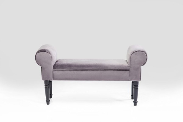 Die Bank Wing Grau ist eine kleine gepolsterte Sitzbank mit grauem Bezug in Samtoptik und ein praktisches Möbelstück für jeden Raum. Der Bezug ist streichelweich und die klassische Form verleiht der Bank einen dekorativen Charakter.